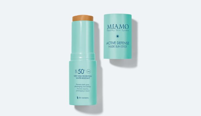 Miamo Active Defense Nude Sun Stick SPF50+ è uno stick labbra resistente all’acqua, che non lascia segni colorati sulla pelle. Anzi, può essere applicato abbondantemente e uniformemente prima di esporsi al sole e durante l’arco delle giornate trascorse al mare, ogni volta che se ne sente il bisogno. La protezione SPF 50+ lo rende un filtro adatto anche ad una protezione delle labbra durante le giornate primaverili con il sole più intenso oppure per contorno occhi e piccole macchie del viso. Contiene vitamina E per un’azione antiossidante, olio di semi di girasole per combattere il foto invecchiamento e aloe, che ha potenti effetti rinfrescanti e lenitivi quindi utile in caso di irritazioni.
