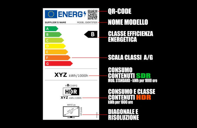 L’etichetta energetica dei monitor PC è identica a quella dei televisori e si articola in quattro sezioni principali. Nella parte superiore sono riportate le informazioni generali, tra cui il nome del produttore e il modello del monitor. Qui è sempre presente anche un QR code, che, una volta scansionato con lo smartphone, permette di accedere all’etichetta in formato digitale e consultare il database europeo EPREL per verificare la disponibilità delle parti di ricambio per il dispositivo. Le due sezioni centrali dell’etichetta riguardano i consumi energetici, espressi in kWh per 1000 ore di utilizzo. Il primo valore si riferisce al consumo in modalità SDR, mentre il secondo indica il consumo con HDR attivo, una tecnologia sempre più diffusa nei monitor di ultima generazione. Quest’ultimo valore risulta generalmente più elevato, poiché l’HDR richiede una retroilluminazione più intensa, aumentando così il dispendio energetico. Alla modalità HDR è inoltre associata una classe di efficienza energetica, espressa su una scala da G (meno efficiente) ad A (più efficiente). Infine, l’ultima sezione dell’etichetta fornisce dettagli sulle dimensioni del monitor, indicando la diagonale dello schermo in centimetri e pollici, oltre alla risoluzione espressa in pixel orizzontali e verticali. Queste informazioni aiutano a valutare non solo l’efficienza energetica del dispositivo, ma anche le sue caratteristiche tecniche essenziali.