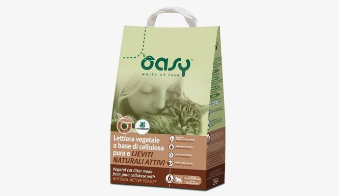 Lettiera Oasy Vegetale è una lettiera vegetale agglomerante. Eliminabile nel wc o nei rifiuti organici, è composta da micropellet ed è in grado di tenere sotto controllo gli odori. Ne esistono diverse versioni: a base di fibre di soia, amido di mais e gomma di guar (Lettiera Vegetale Tofu) e a base di piselli (nella variante senza profumazione e in quella con profumazione al tè verde).