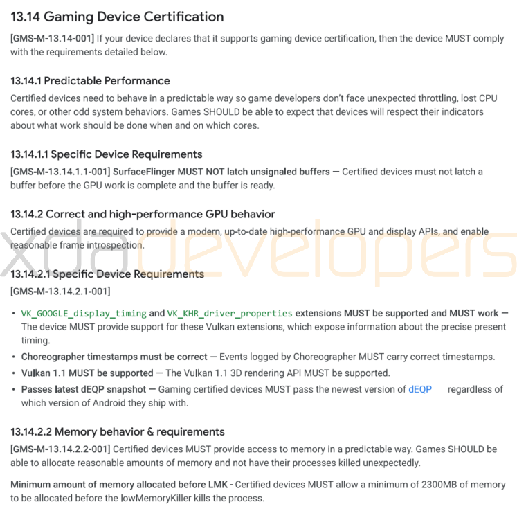 Ciò che viene sottolineato è che i dispositivi debbano comportarsi in maniera prevedibile per gli sviluppatori in modo da evitare fenomeni che possano incidere in maniera negativa sulle prestazioni, come il throttling termico, ovvero l’innalzamento repentino delle temperature che causa l’abbassamento delle frequenze operative. Il discorso rimane abbastanza vago anche sulla GPU, con un riferimento che afferma che la scheda grafica deve essere aggiornata in modo da fornire alte prestazioni e supportare inoltre le API Vulkan 1.1, oltre che superare i test di conformità grafica OpenGL ES/Vulkan forniti da Khronos.