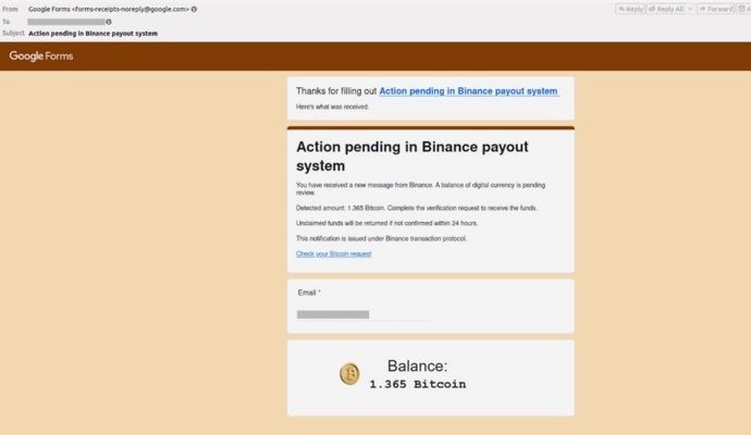 Tutto inizia con la raccolta dell’indirizzo e-mail della potenziale vittima. A quel punto, gli aggressori compilano un modulo Google utilizzando l’account della vittima come destinatario della conferma automatica. Il messaggio che ne deriva simula in tutto e per tutto una comunicazione ufficiale proveniente da una piattaforma di scambio di criptovalute, tanto da riportare un presunto accredito imminente e un invito a cliccare su un link per ricevere l’importo, con tanto di scadenza imminente. In realtà, il collegamento porta a un sito fasullo che imita l’aspetto delle vere piattaforme crypto e che chiede all’utente di contattare un sedicente “supporto blockchain” e versare una “commissione” in criptovaluta per completare la transazione.