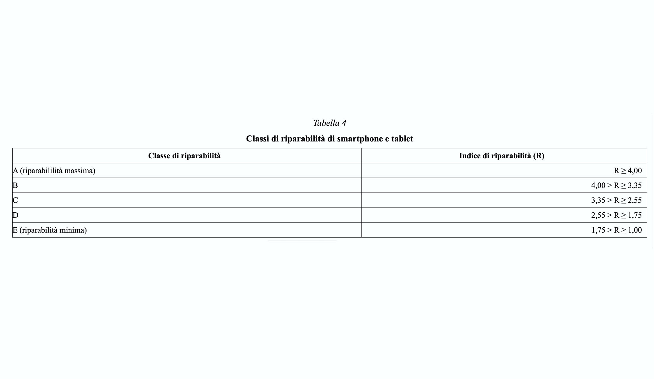 La classe di riparabilità di uno smartphone o di un tablet è determinata in base all’indice di riparabilità, come indicato alla tabella 4. Il punteggio aggregato è pari al valore calcolato ricavato da sei parametri di punteggio che comprendono profondità di smontaggio, elementi di fissaggio, tipi di attrezzi, pezzi di ricambio, durata degli aggiornamenti software, informazioni sulla riparazione. Il regolamento concentra lo sguardo soprattutto sulle parti normalmente soggette a sostituzione o riparazione come ad esempio lo schermo, la batteria, la porta USB-C, etc.