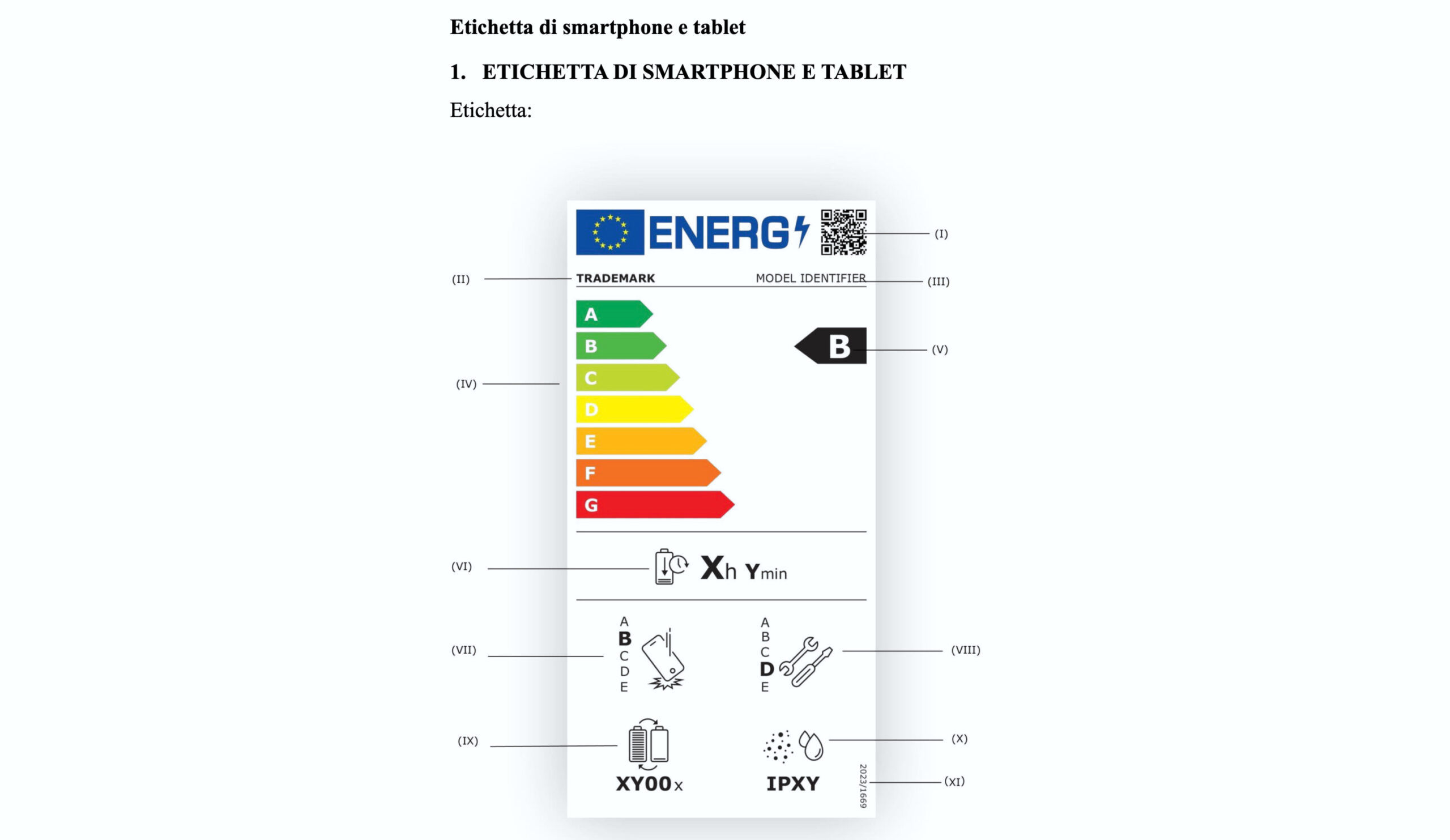 Le nuove etichette per smartphone e tablet graficamente ricordano quelle degli elettrodomestici ma oltre alle classiche strisce colorate relative alle categorie di consumo, sono presenti altre icone distintive. Entrando nel dettaglio vengono specificate la durata delle batterie per ciclo in ore e minuti, la classe di affidabilità, la classe di riparabilità, la durata della batteria in cicli operativi e il livello di protezione da agenti esterni.