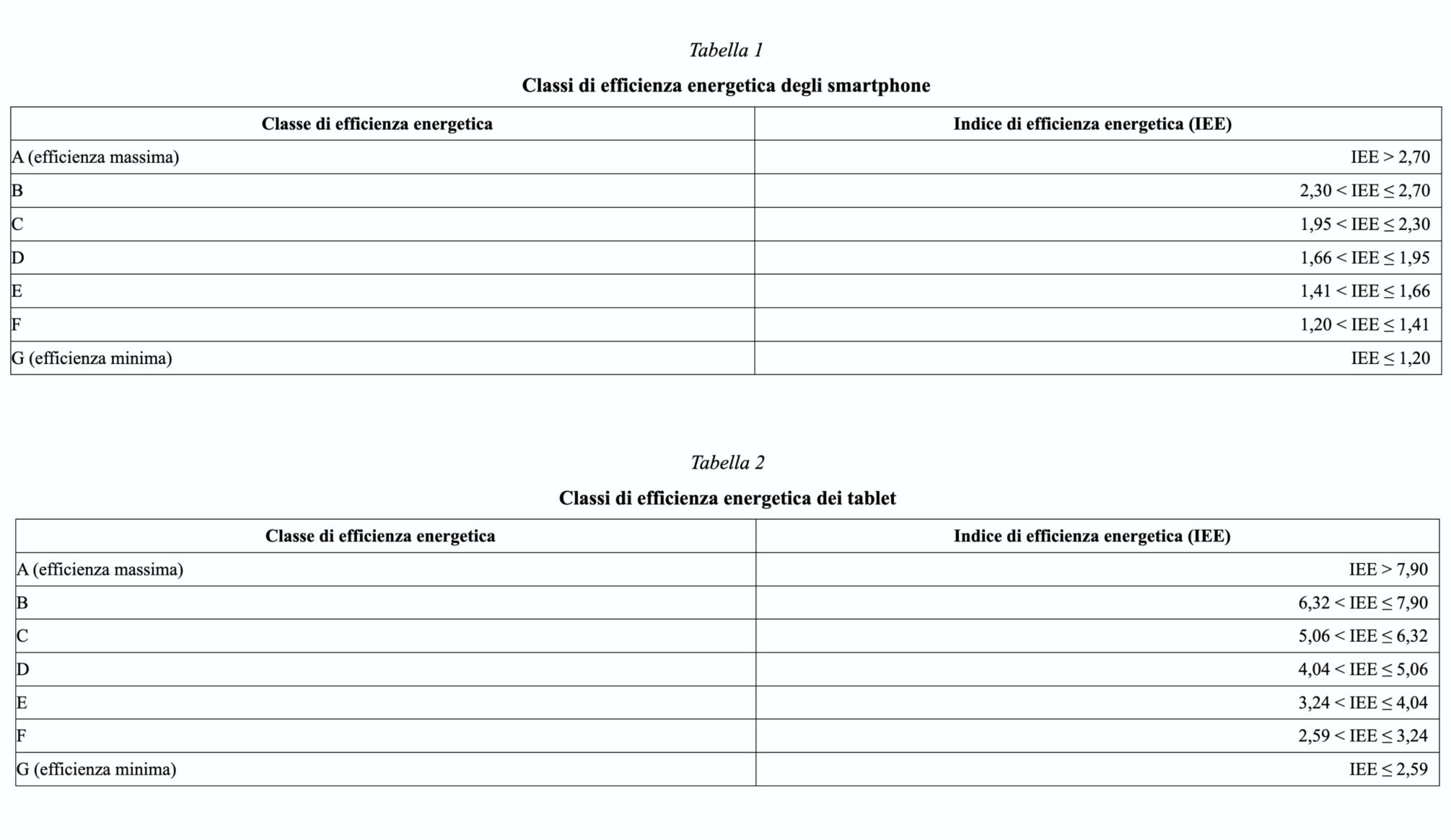 La classe di efficienza energetica di uno smartphone o di un tablet è determinata in base all’indice di efficienza energetica (IEE), come indicato alla tabella 1 per gli smartphone e alla tabella 2 per i tablet. Ovviamente tutte le applicazioni sono chiuse, la luminosità invece è impostata a 200 cd/m2 utilizzando un’apparecchiatura esterna per verificare tale impostazione, tutti i volumi audio (chiamate e media) sono impostati a 75 dBa a una distanza definita.