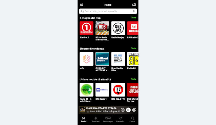 Su Radio.it è presente, inoltre, una ricca sezione dedicata ai podcast in cui sono presenti i principali podcast italiani che è possibile ascoltare in streaming oppure scaricare ed ascoltare offline. Molto utili le funzioni di cancellazione automatica degli episodi e di mirroring per trasmette l’audio su un dispositivo esterno.